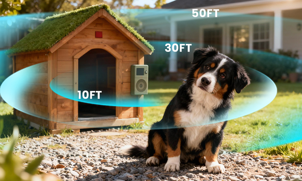 Max Coverage: The impressive 50-foot effective range automatically stops barking right at the source, covering your entire backyard (Total Property Coverage).
